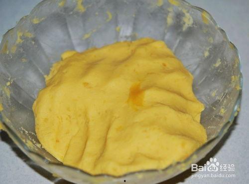 将发酵好的面团取出,揉搓排气,然后分成若干个小剂子。将红薯泥加入适量的白糖,搅拌均匀,作为饼馅。